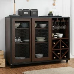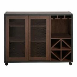 The Furniture of America Helibra Walnut Contemporary 2-Sliding Door Buffet is ready for any role, from a daily-use cabinet to a decorative anchor that only springs into action on special occasions. The style gets a dash of industrial appeal from the metal frame and metal mesh that covers the sliding doors. The metal has a black finish that perfectly contrasts the espresso-toned finish of the wood veneers. There’s no shortage of storage, with a dedicated spot for eight bottles of wine and three wide shelves behind those sliding doors. The hanging stemware rack is a must for anyone who takes their vino seriously, and the wide top is perfect for serving or just keeping a few tasteful decorative objects.