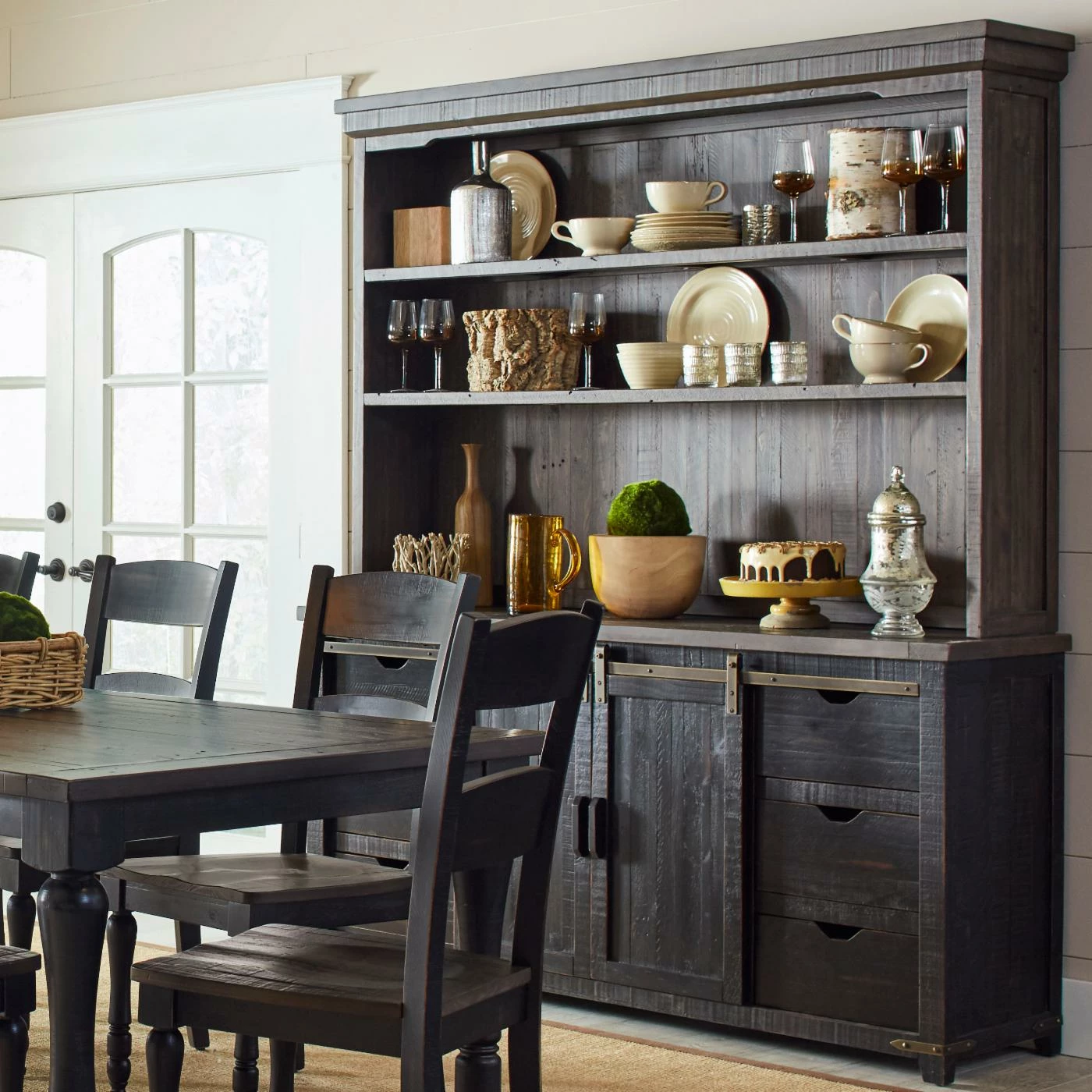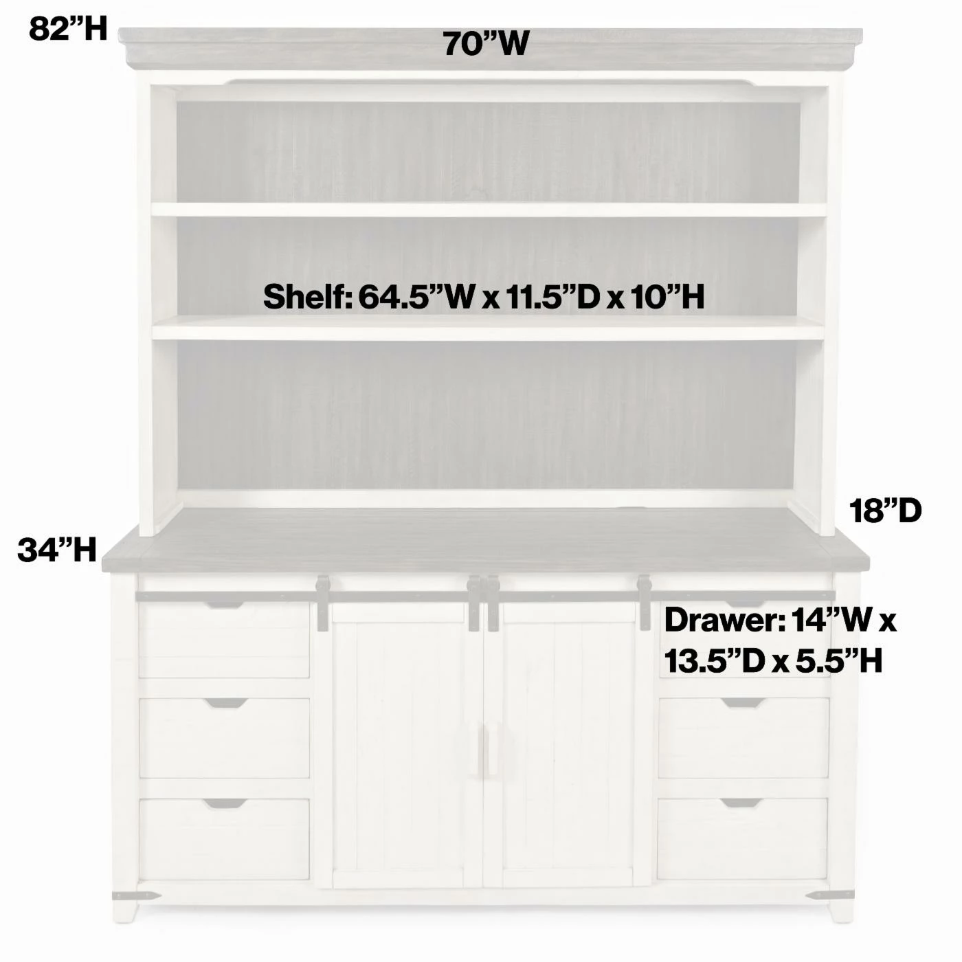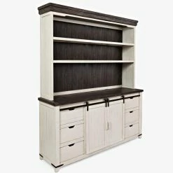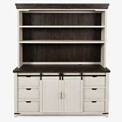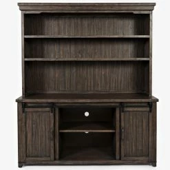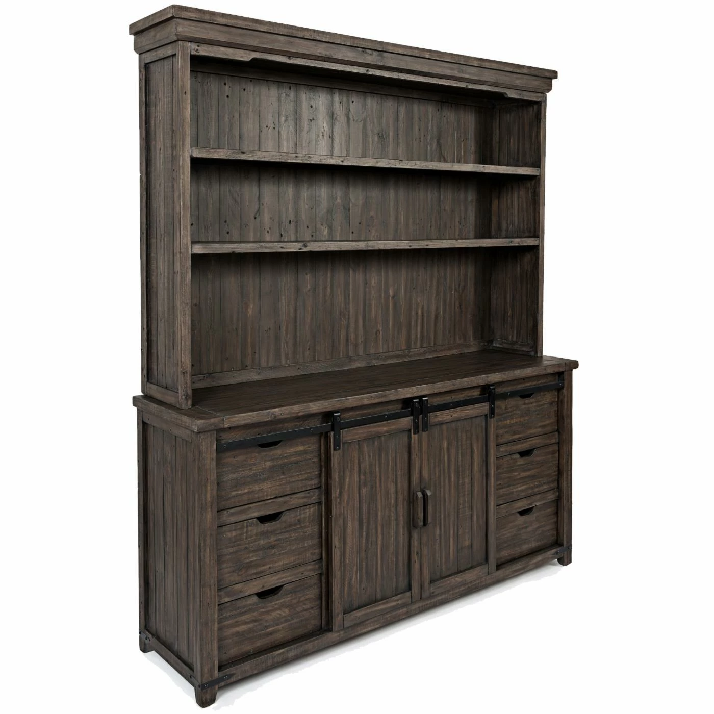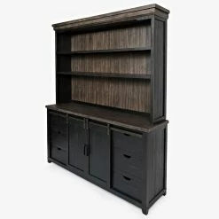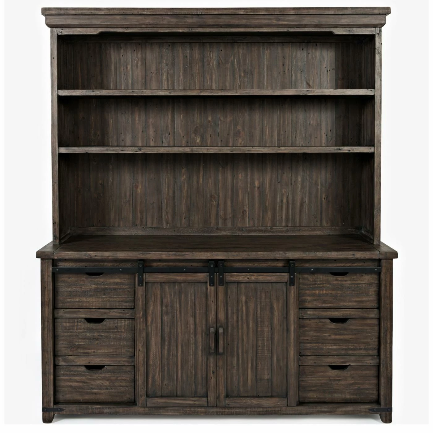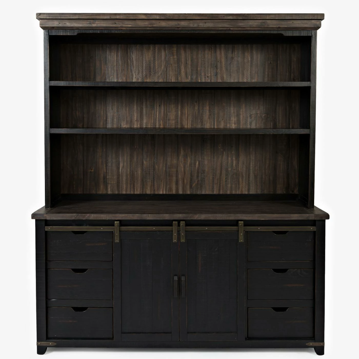 The modern farmhouse Jofran Madison County Hutch Server boasts two sliding barn doors, dark metal corner brackets, and wood plank details. Designed to be as handy as it is handsome, this hutch and server combo offers two wide, fixed shelves for display. Slide the barn doors to reveal six drawers with notched pulls, an adjustable center shelf, and two wire management holes. Reclaimed pine wood construction and your choice of available distressed finish options enhance the rugged appeal of this hutch server.