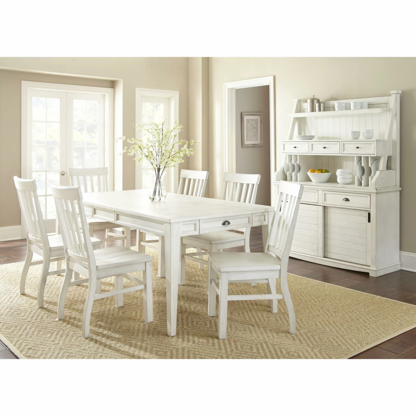 Fill your farmhouse kitchen or dining room with the inviting country style of the Steve Silver Co. Cayla Farmhouse Dining Buffet with Hutch. Display antique dishes on the open shelving or vertical plate storage racks. Flatware can go in the three felt-lined drawers at the top and linens stored in the two larger drawers below. The planked sliding doors contain an adjustable shelf behind each. A distressed, antique white finish creates an aged look.