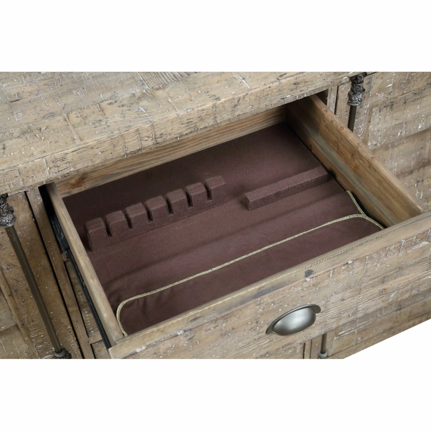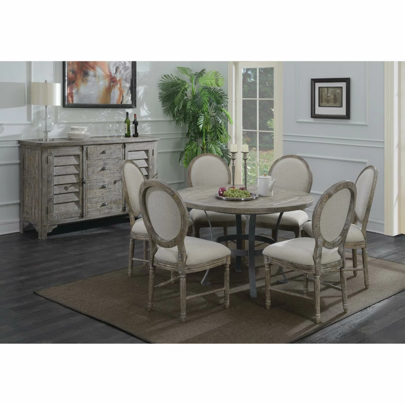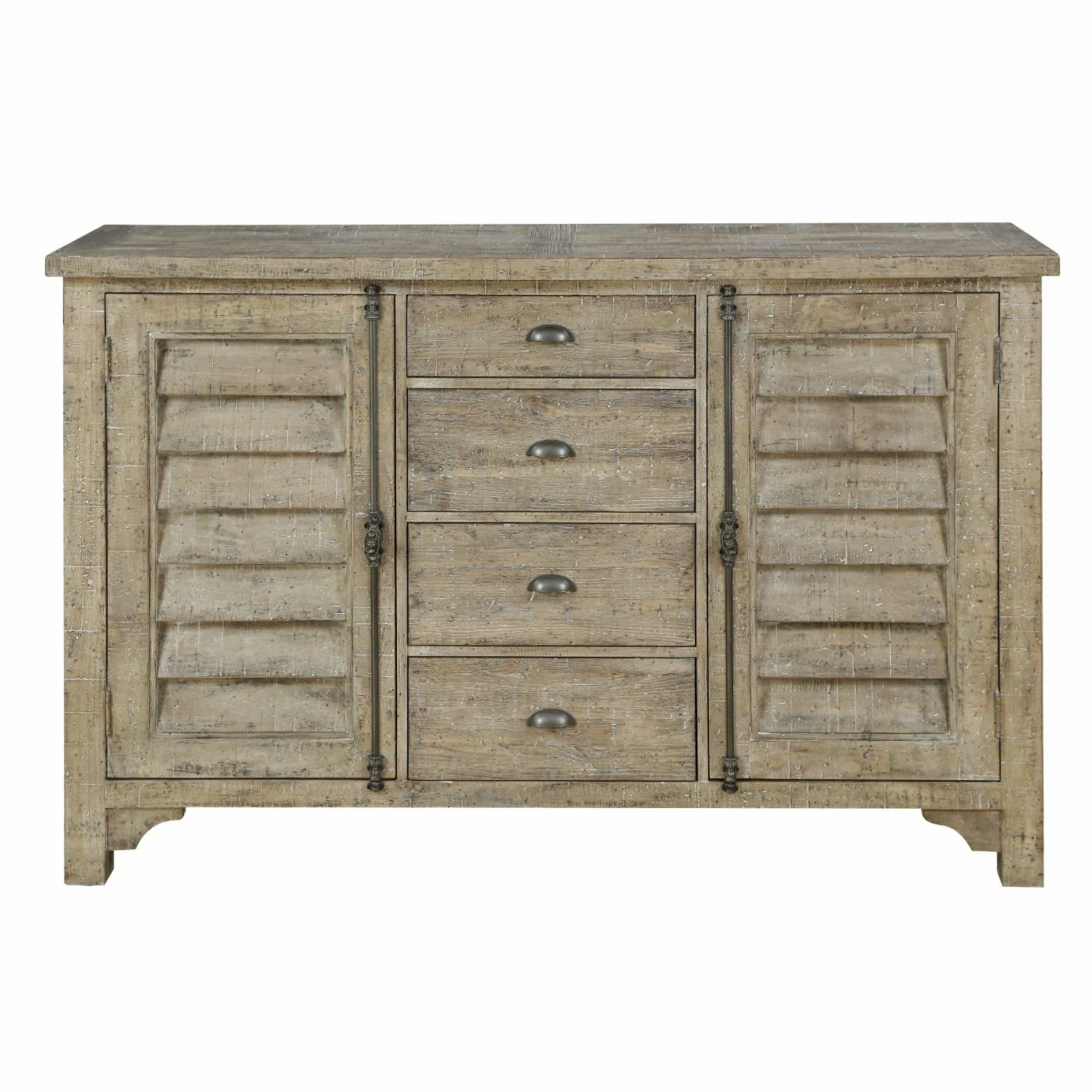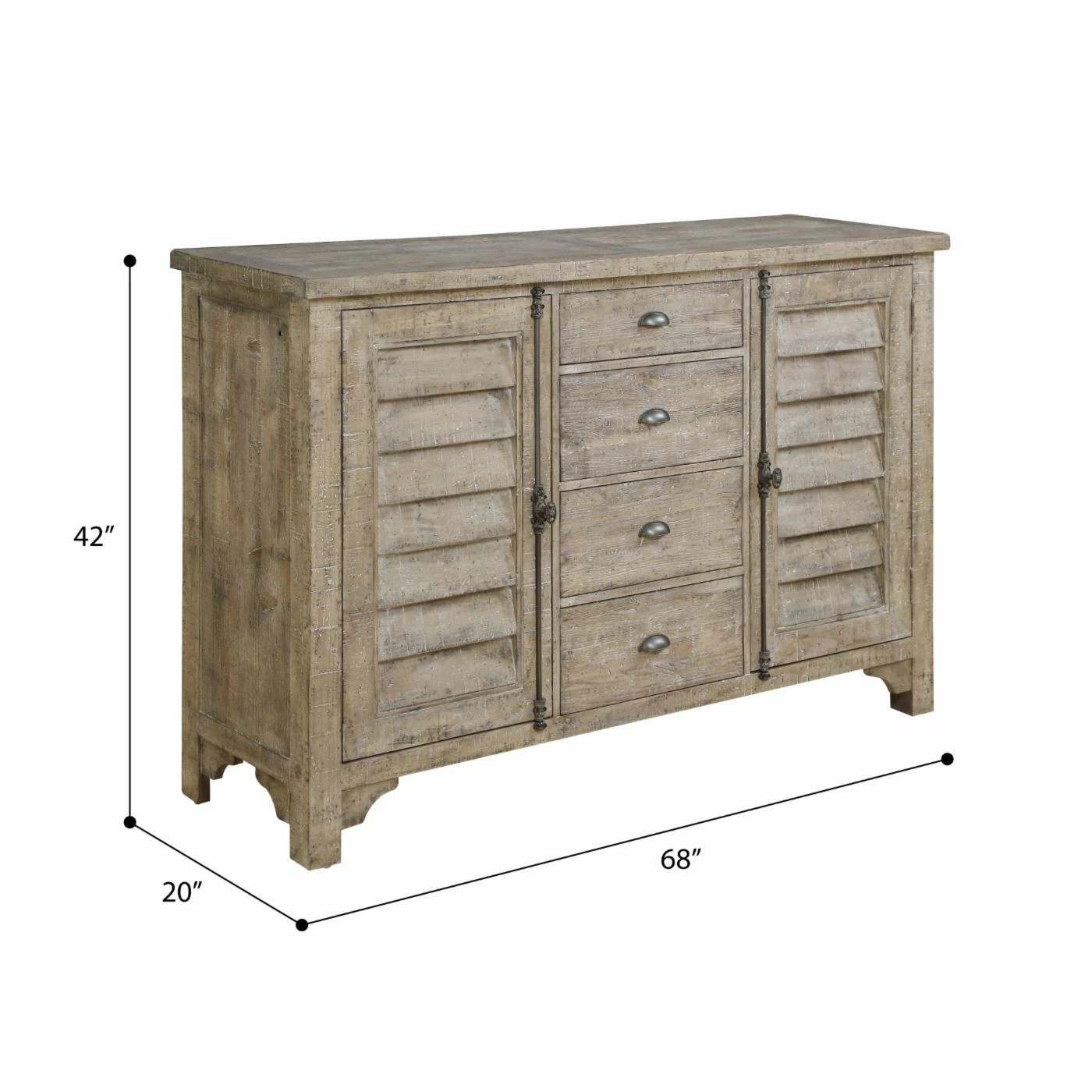 The shutter doors and weathered finish give the Wallace & Bay Haynes Dining Buffet that rustic farmhouse look for your dining area. It features a felt lined drawer to help protect your silverware, as well as 3 additional storage drawers. Behind the doors there are 6 shelves to house your fine china or other special keepsakes. The distressed sandstone buff finish completes the rustic charm of the dining buffet.