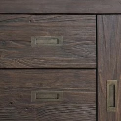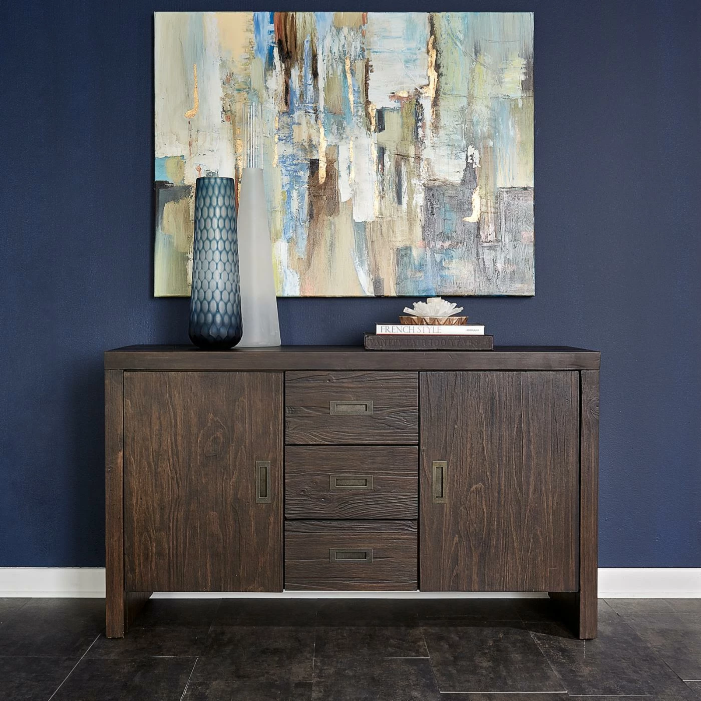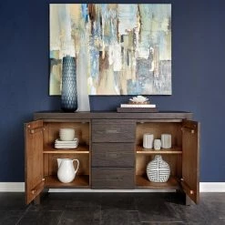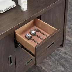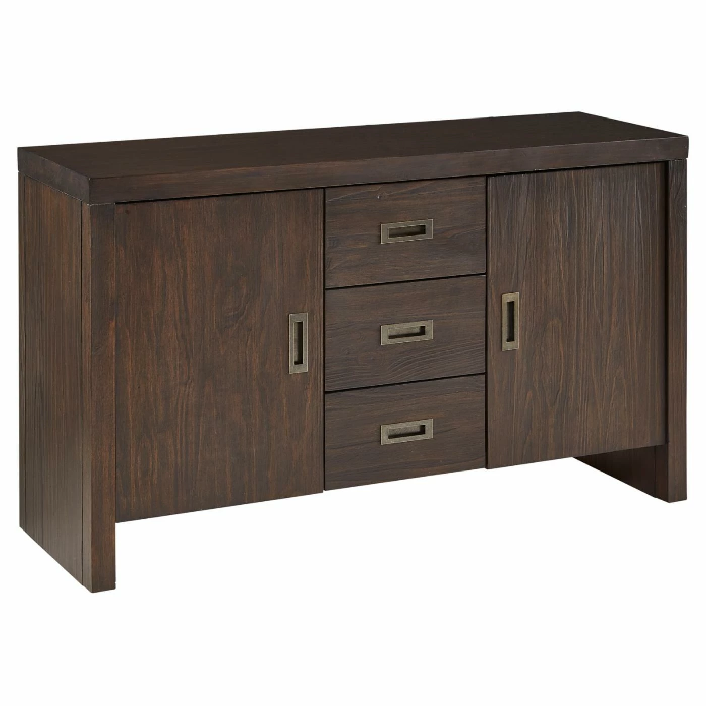 The A-America Palm Canyon 54 in. Sideboard is one of true service and style for dinner parties. Crafted from solid New Zealand pine wood and finished in an eight-step carob brown finish with a hand-applied distressing process using a wire brush, this sideboard features three spacious storage drawers and two large side cabinets, each fitted with magnetic door closures and a fixed shelf to create 4-shelf closed storage. The top drawer is felt-lined for silverware and barware. The drawers and cabinets have recessed pulls finished in antiqued bronze for a stunning accent to complete the look. This sideboard requires some simple assembly and is covered by a manufacturerβs limited 1-year warranty.