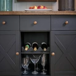 The A-America Stone Creek 52 in. Server is your new storage and workspace for crafting cocktails and opening your favorite bottle of wine or bubbly. Crafted from kiln-dried solid rubberwood and finished in black, this server features a 1.5-inch top with a 7-step, two-tone chickory finish. This server has light distressing to lend a transitional farmhouse look ready for any-style space. The three top drawers are felt lined for storing your bar tools and equipment. The two cabinet doors with a classic crossbuck design shelf for organized storage option that remains out of sight. The two open shelves at the center come with removable 3-bottle wine racks for added convenience. The drawers and cabinets are fitted with coordinating wood knobs in brown to complete the look. This server requires some simple assembly and is covered by a manufacturerβs limited 1-year warranty.