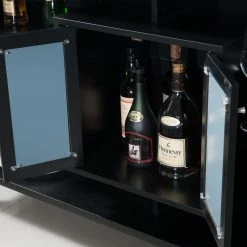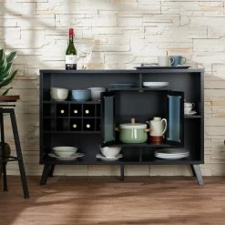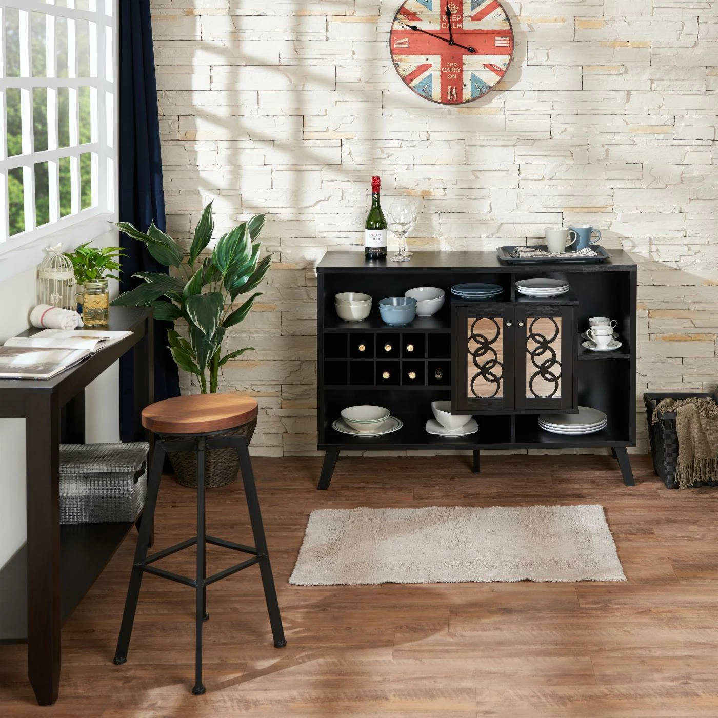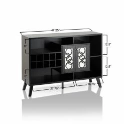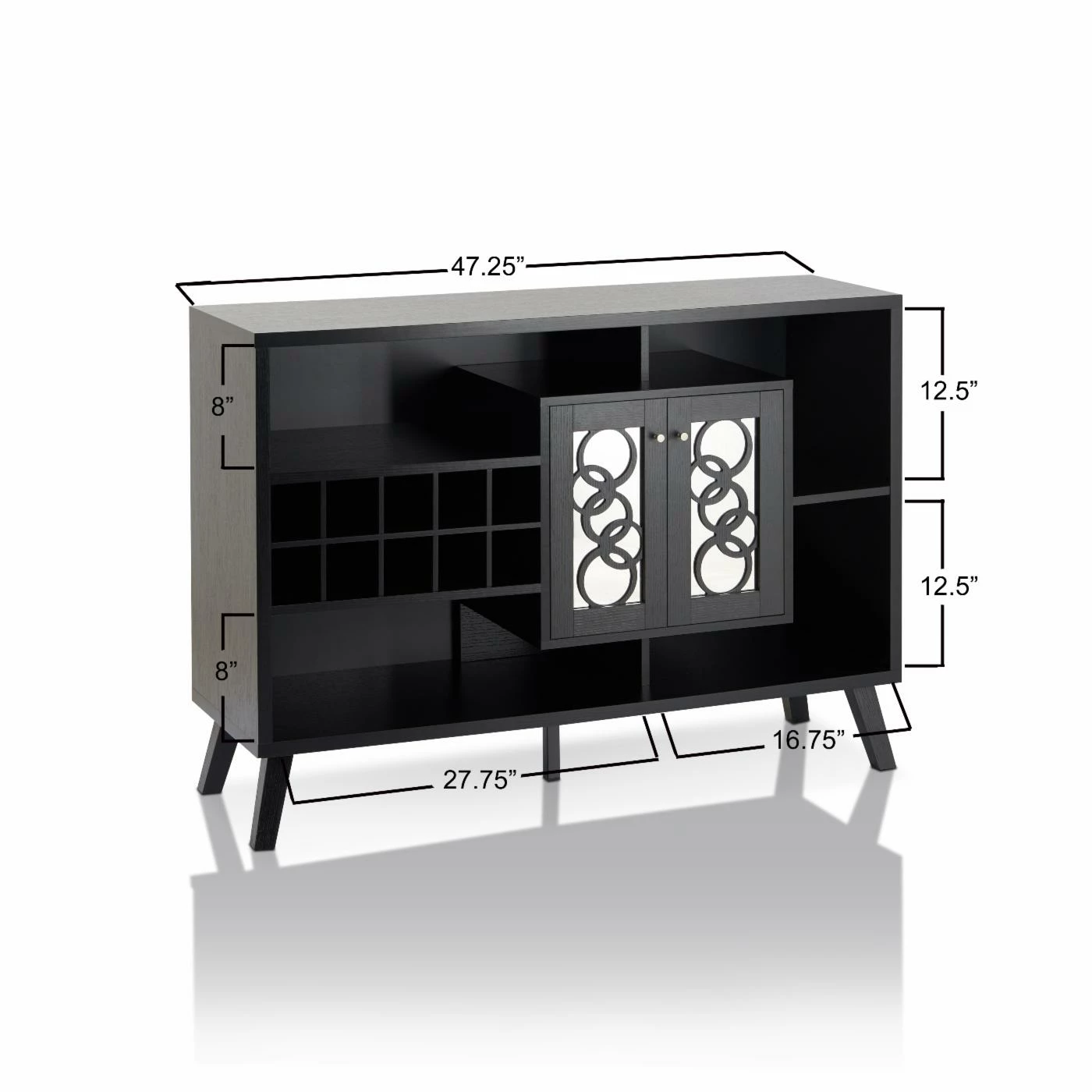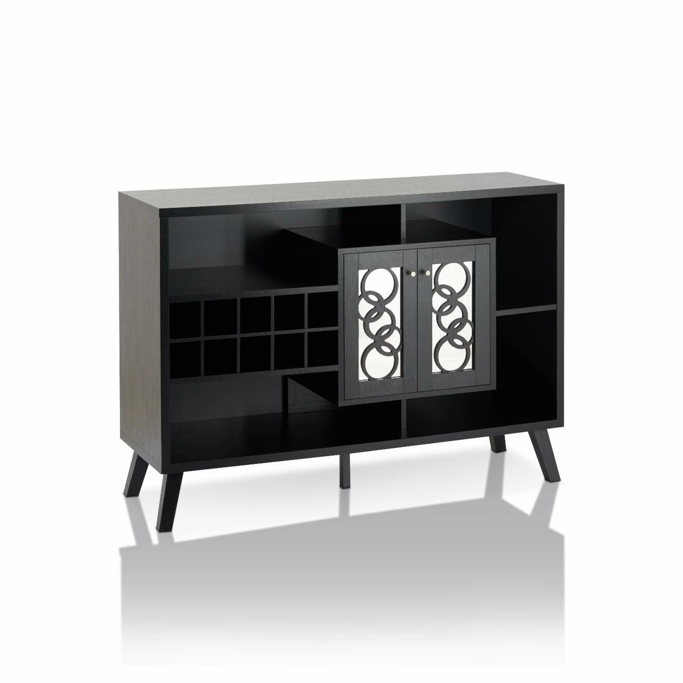 Never fear; theΒ Furniture of America Allisa Modern Buffet- CappuccinoΒ is here to help you entertain and store your drinkware and dishes. This versatile, modern piece features durable MDF wood and veneer construction with a chic black finish. It boasts storage space aplenty with a double door cabinet, which has ornate circular motifs and a magnetic closure. Four open storage compartments and 10 standard size wine bottle slots keep everything organized and in its right place. This piece sits on tapered legs and requires some easy assembly.