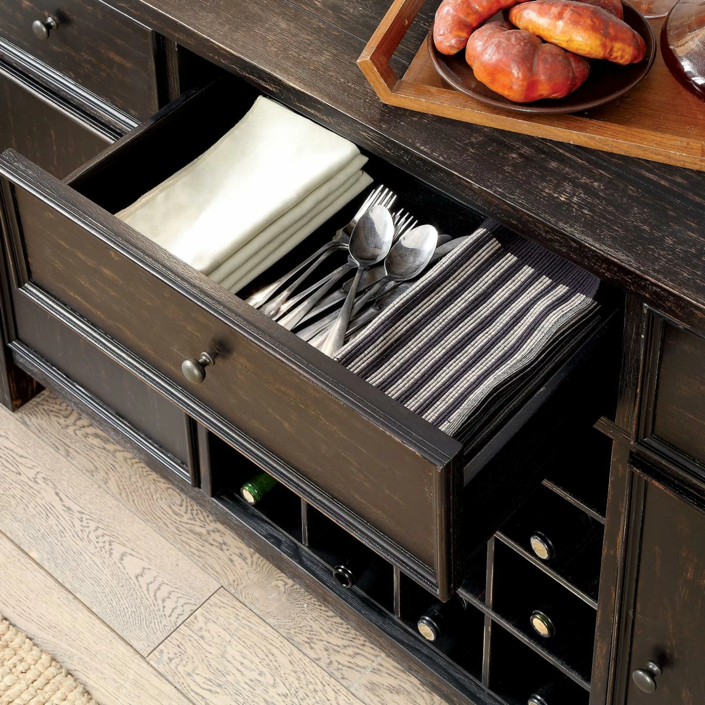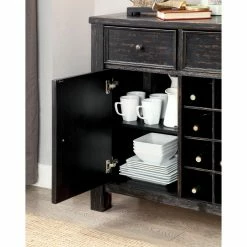 Make entertaining easy by keeping all of your essentials neatly organized within the Furniture of America Oper Rustic Multi-Storage Dining Server. This sturdy rubberwood buffet in antique black finish is the very image of rustic sophistication. Its weathered details and aged metal hardware add character to any room, particularly the dining area. Keep napkins, silverware, platters, holiday dΓ©cor, and more sorted and ready for any special event! The server offers three drawers, two cabinets with enclosed shelving, and a built-in center wine rack that fits 16 standard-size wine bottles. Some assembly is required.