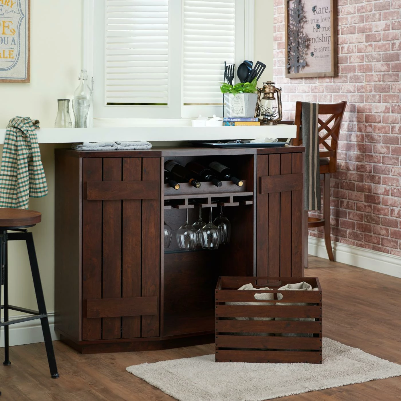 Rustic style and modern function have brought a friend over, and the Furniture of America Ralley Vintage Walnut Transitional Removable Crate Server is one friend that you won’t mind hosting for a long time. This handsome cabinet is ideal as a bar, sideboard, or just an accent piece in your living room. The body is crafted from rugged MDF with a veneered exterior that’s finished in a classic shade of walnut. Slats of solid wood cover the side storage cabinets, and a matching removable crate adds function and visual style to the design. For the wine enthusiast, there’s a rack for hanging stemware below a dedicated space to hold four of your favorite vintages.