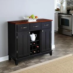 A great combination of elegance and function, the Large Wood Server Kitchen Island keeps your kitchen organized while making optimum use of your space. Made from quality hardwood and wood products, it has three utility drawers and two one-door cabinets with an adjustable shelf for plenty of storage. The wine storage area at the center can be removed for open storage if desired. The server base is available in a selection of finishes while the top comes in 18-gauge stainless steel or in a choice of wood finishes. Overall DimensionsΒ : 41.75W x 17D x 36.25H inches.
