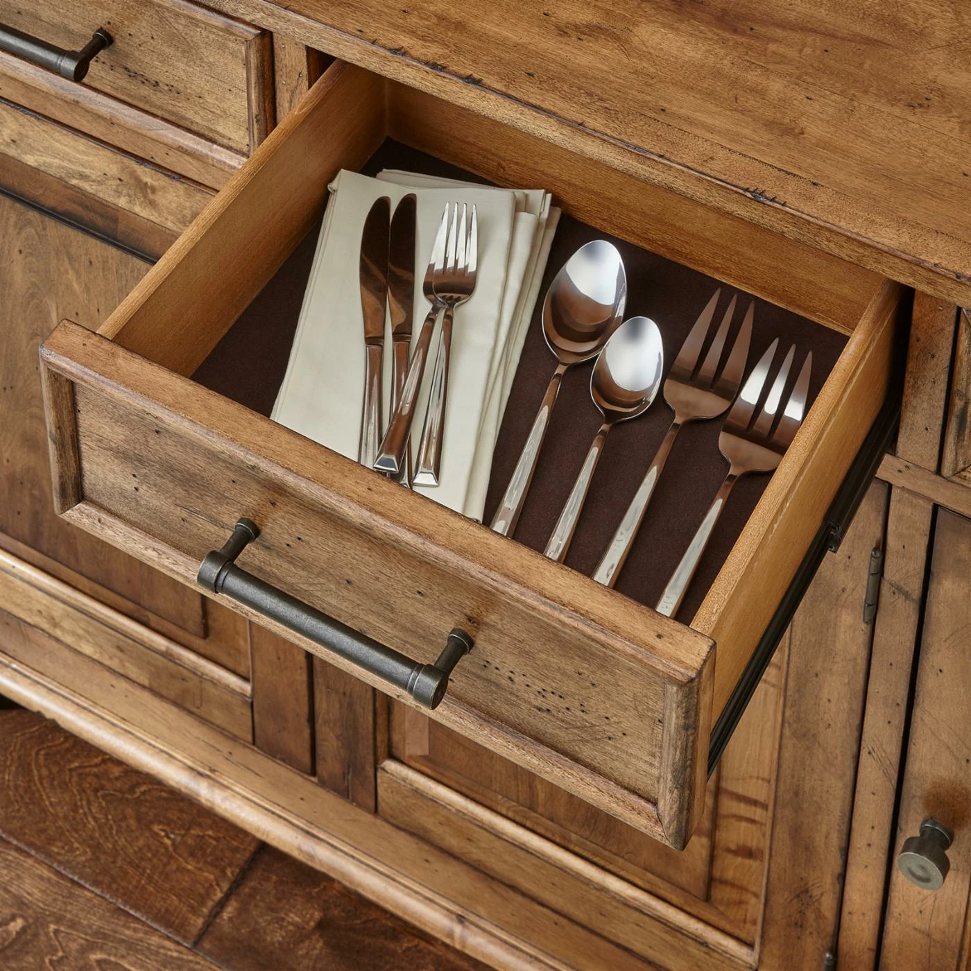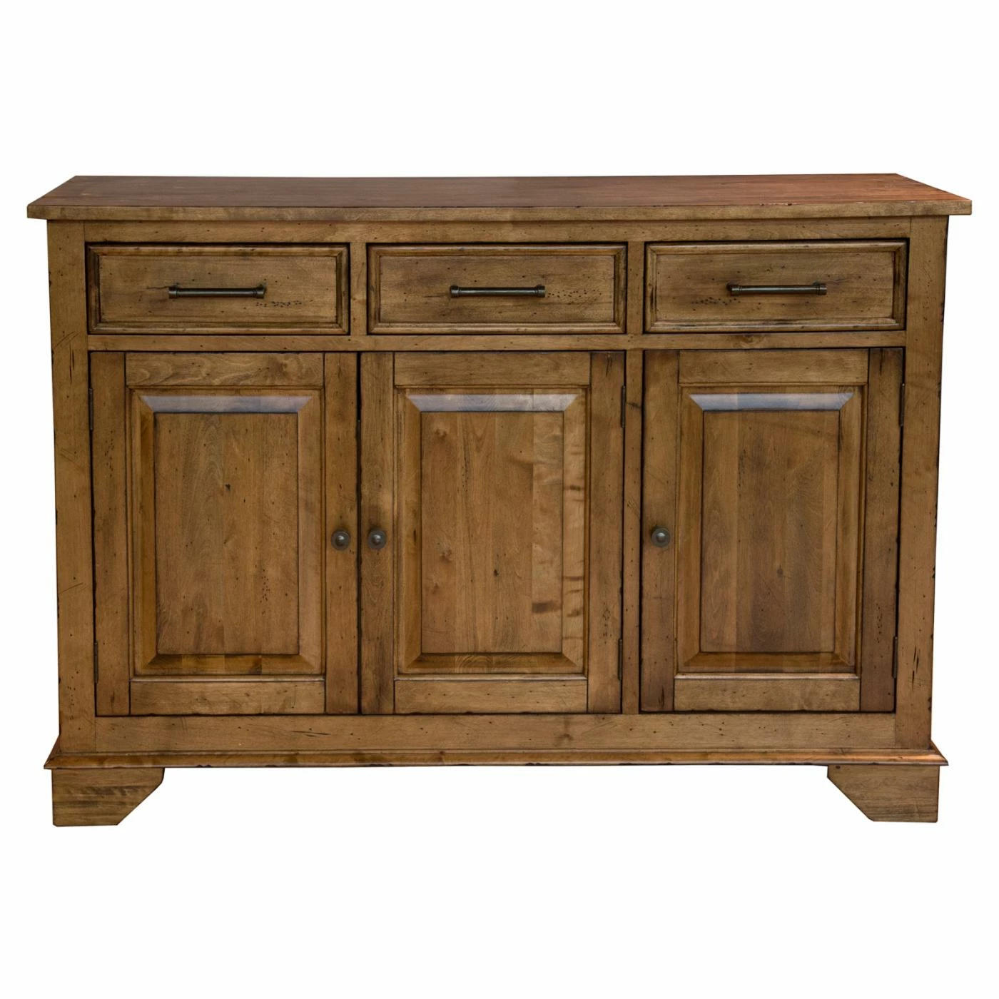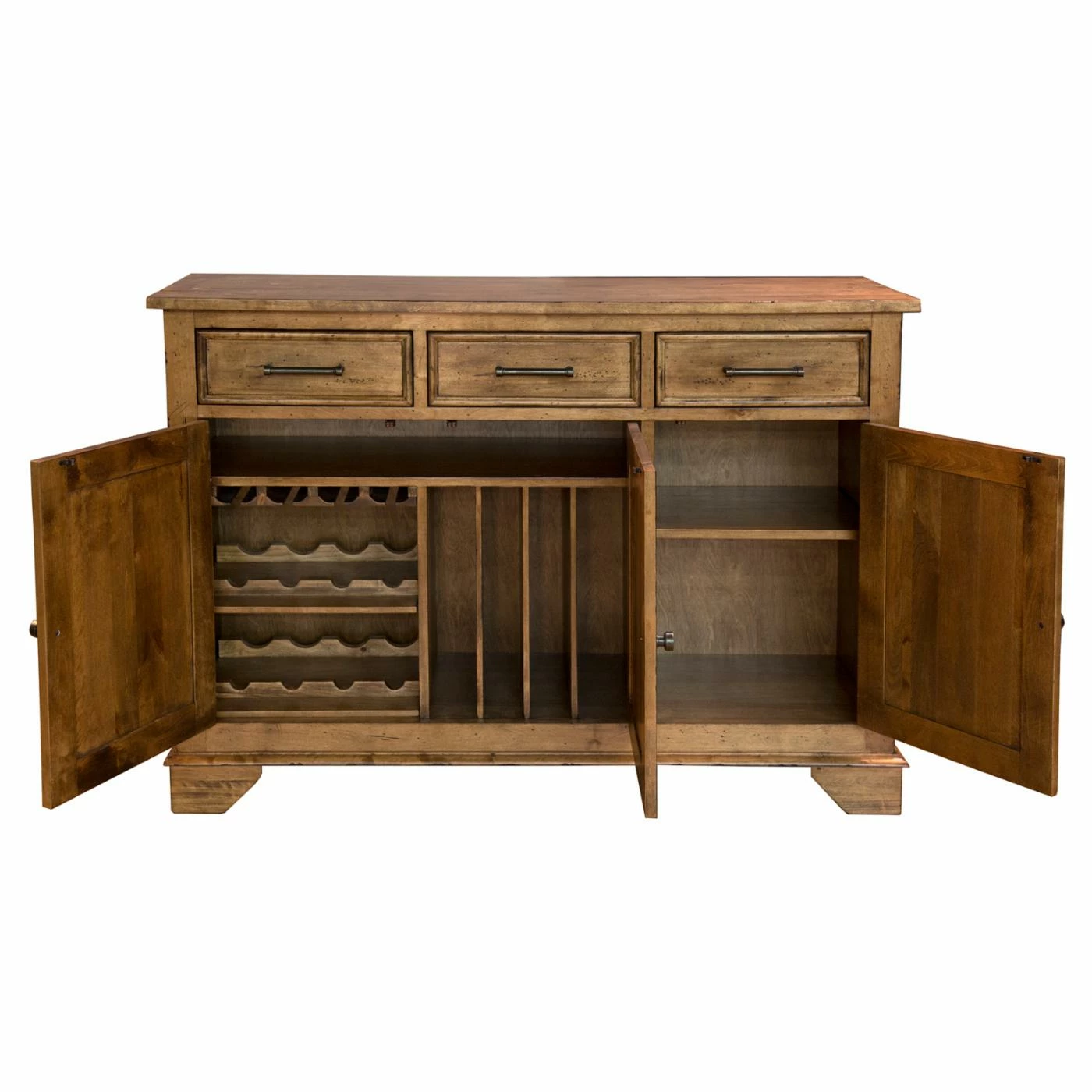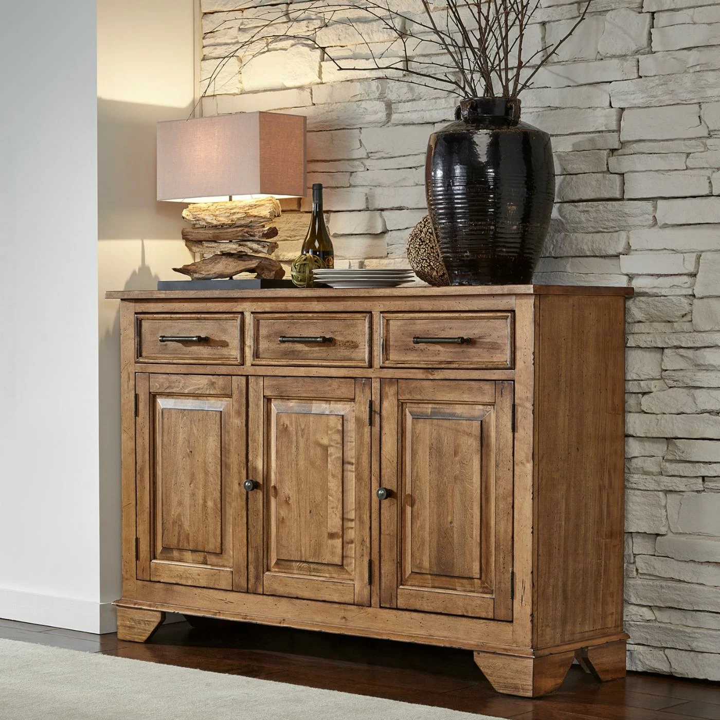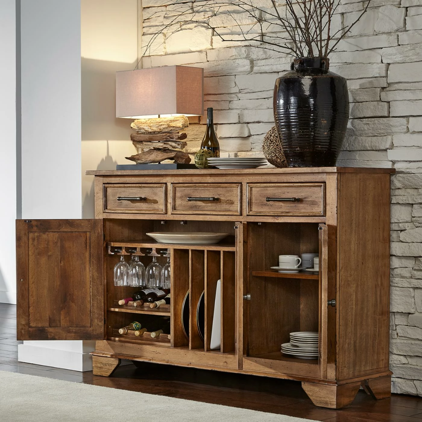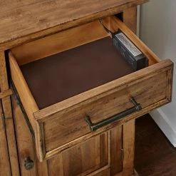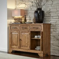 Natural wood grain and knots give the A-America Bennett 3 Door Server a look that’s rustic and beautiful. Three felt-lined drawers open and close smoothly with full-extension glides. Behind three cabinet doors, you can store wine, serveware, and stemmed glasses. Place your crockpot on the top and plug it into the charging station to keep party food warm. The smoky quartz finish and dark bronze hardware will pair easily with your dining room furniture and dΓ©cor.