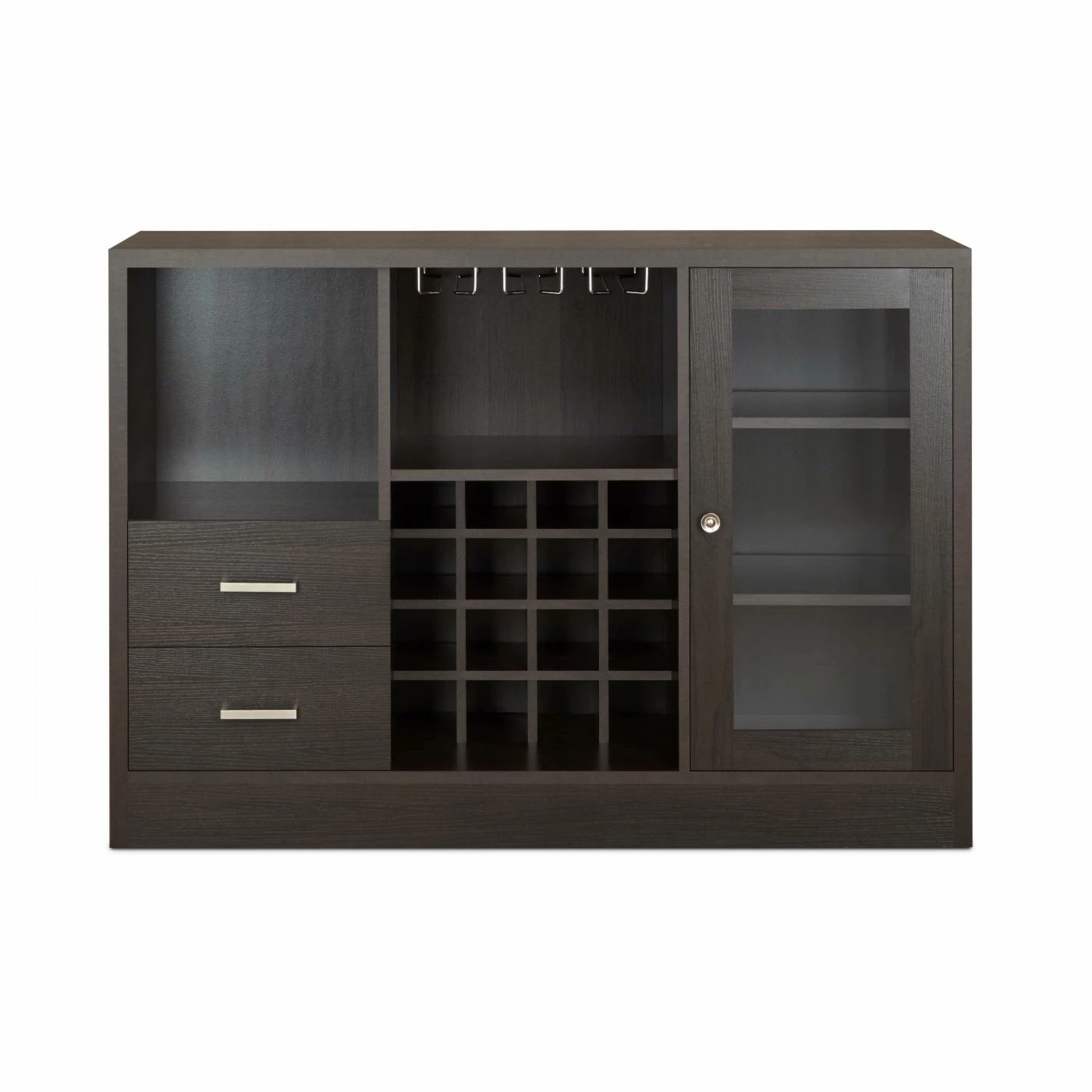 Stylishly tuck away your dishware, drinkware, and more in the Acme Furniture Joice Server. This server boasts a mid-century modern design with an espresso finish and polished chrome hardware. Store your dining essentials on the open shelves or in the two side drawers. The glass-front cabinet door opens to reveal two fixed shelves. It also offers 16-bottle wine storage and a stemware rack.