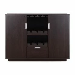 The Furniture of America Jennel Espresso Modern Multi-Storage Dining Buffet has that simple, straightforward style. This modern design is crafted from solid panels of robust MDF with a veneered exterior that’s finished in a shade of classic espresso. Silver-finished metal pulls open a drawer and two covered storage spaces, allowing you to keep all the serving pieces, favorite libations, linens, and whatever else you want, stashed in the interior. Each side has a pair of shelves, and in the center you get dedicated storage for six bottles of wine beneath a stemware rack for your wine glasses.