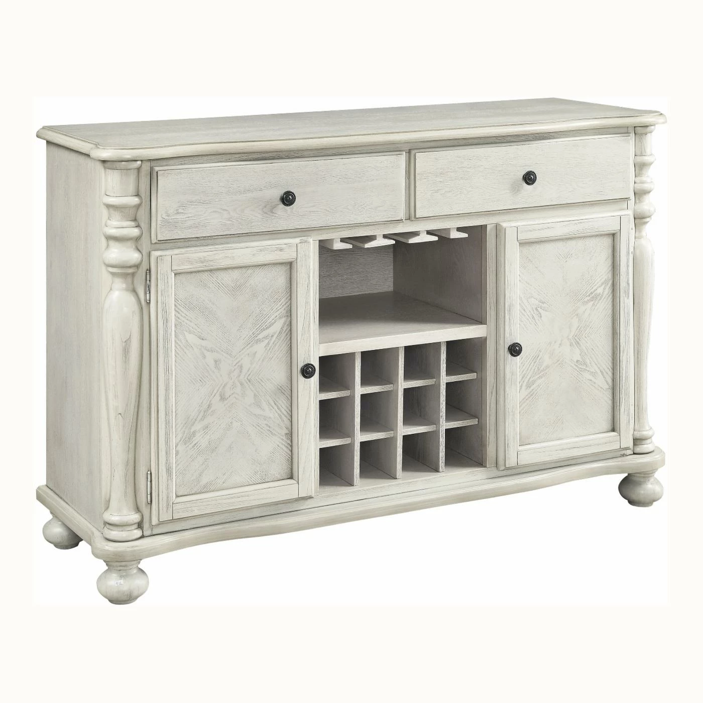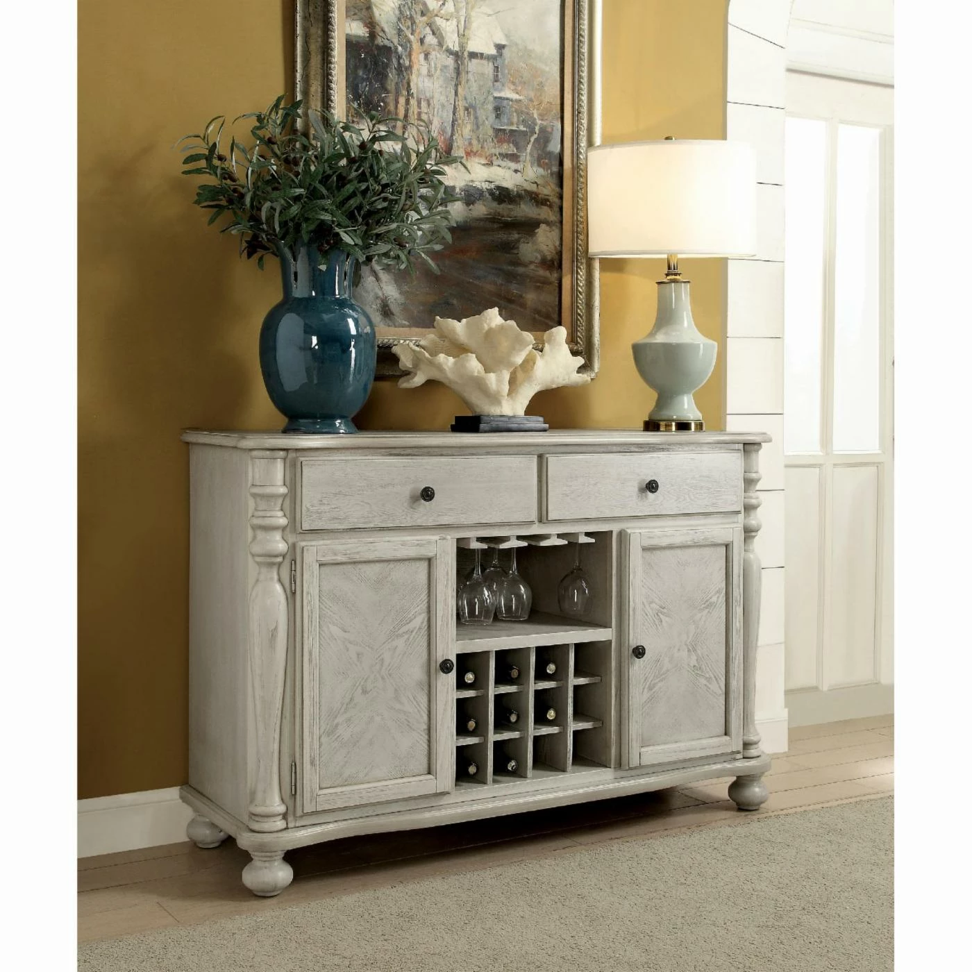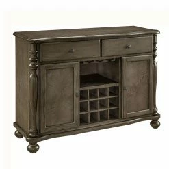 Serve up your favorite libations with the Furniture of America Lillian Traditional Server. This rustic server boasts sturdy wood and veneer construction. Store utensils, bottles, napkins, and more in the two drawers, two cabinets, and four shelves. There’s even an elegant wine rack in the center and a spot for you to store wine glasses.