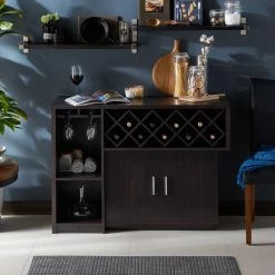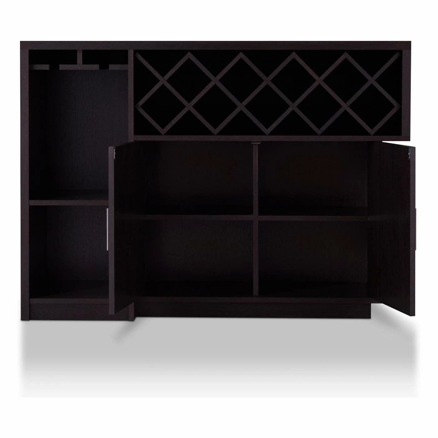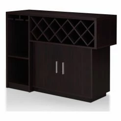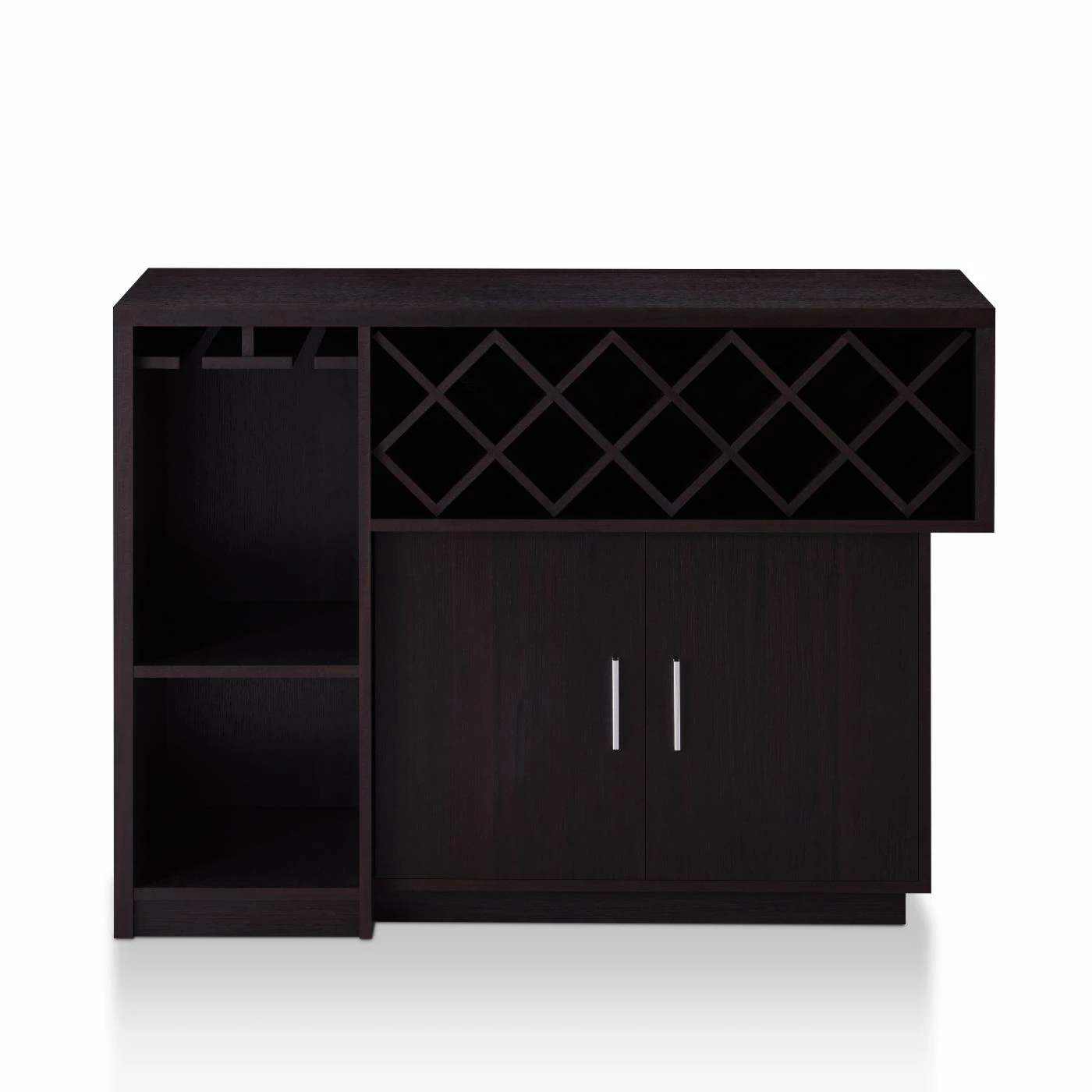 Serve drinks in style with the Furniture of America Ridgemont Contemporary Buffet Cabinet. This sleek and streamlined buffet cabinet boasts wood and veneer construction as well as an espresso finish. Store multiple bottles of your favorite wine and bubbly in the top wine rack. It’s a perfect storage spot for kitchen and serving items with its two shelves and roomy cabinet.