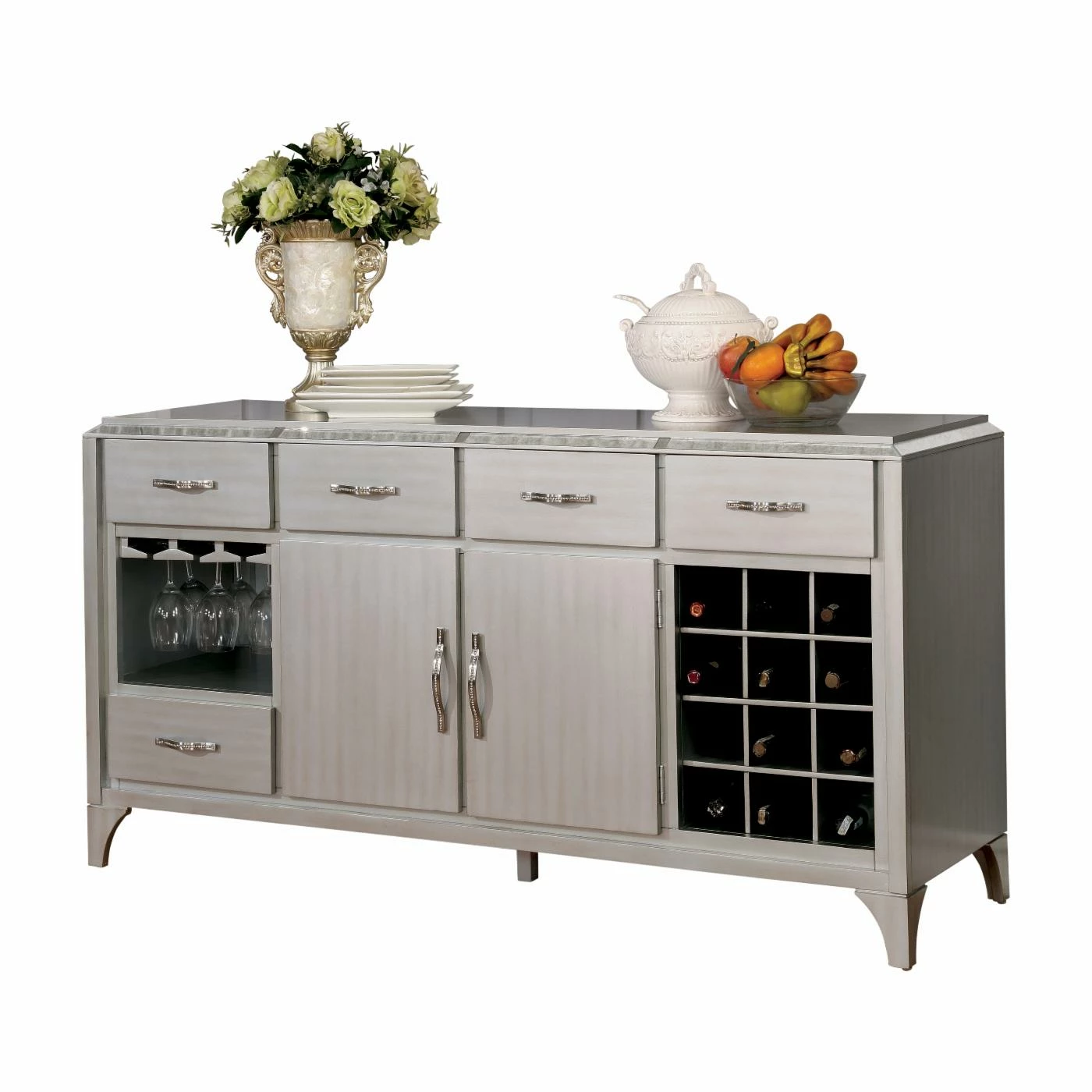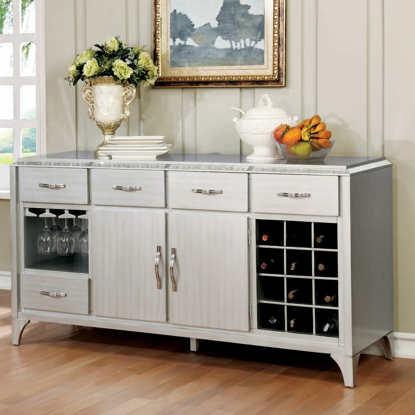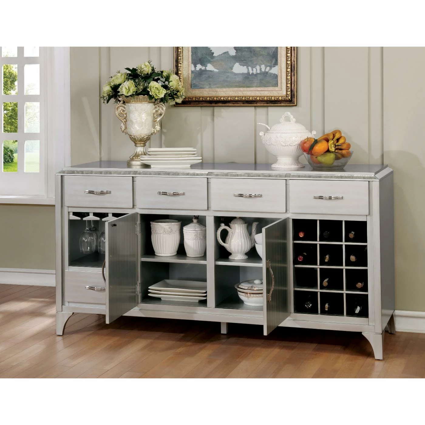 The Furniture of America Telina Contemporary Antique Mirror Multi-Storage Dining Server is a glamorous organizer for plates, silverware, glassware, holiday dΓ©cor, and more. Its sleek structure is crafted from durable rubberwood in a chic silver finish and sports curved silver handles with faux crystal accents. Storage options include five drawers with metal glides, two drawers with four shelves total, a built-in stemware rack with three slots, and a wine rack that can house up to twelve standard-size bottles. Some assembly is required.