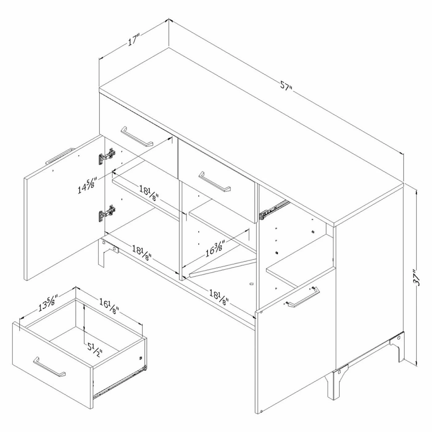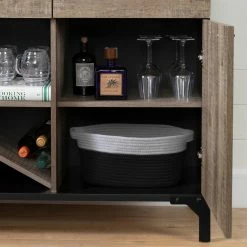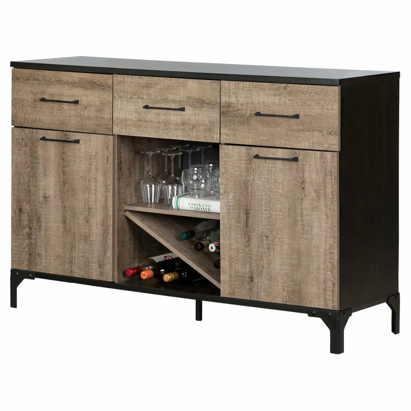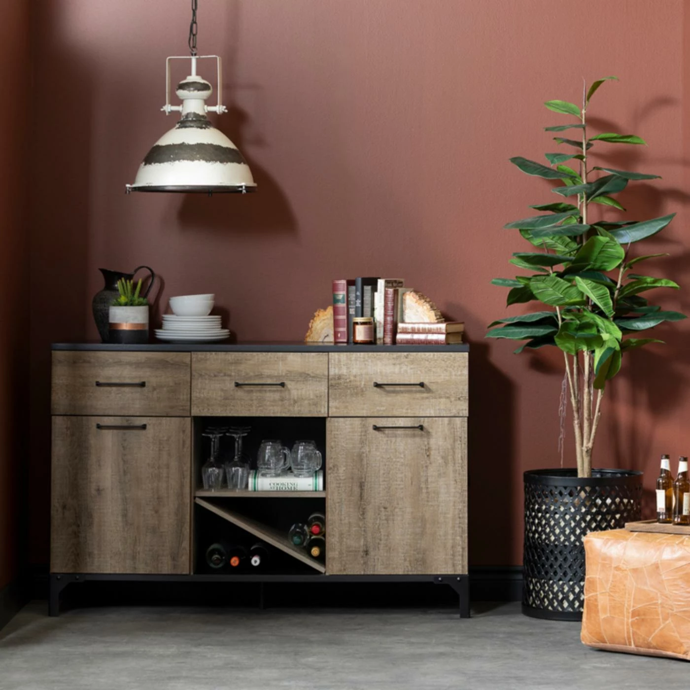 Ultra-stylish yet functional, the South Shore Valet Buffet with Wine Storage boasts a chic-industrial look with a number of practical storage features. This buffet has adjustable shelving that’s perfect for storing wine bottles or even fancy stemware. Three drawers provide additional storage for corkscrews or other barware. With its ebony and weathered oak finish, this buffet boasts a versatile design that will lend designer flair to your dining room, living room, or den. Assembly is required.